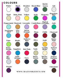 | Font Colour | White, black, heather, royal blue, bottle green, Ash, sand, baby pink, yellow, Kelly, magenta, Hawaiian blue, peppermint, mustard, lavender, candy floss, digital lavender, jade, turquoise surf, fire red, burnt orange, plum, chilli, charcoal, lime, khaki, airforce blue, olive, gold, dusty pink, pinky purple, sapphire, hot pink, nude, vanilla shake, Oxford navy, sky blue, light orange, navy, dusty green, mocha brown, festive fuchsia, purple, chocolate, *You can also opt for your own colour code, please let me know* |